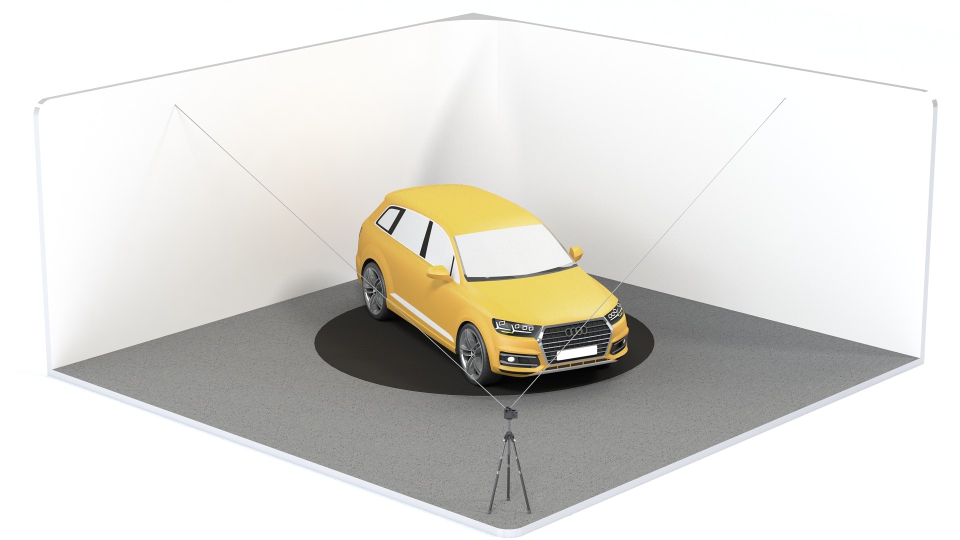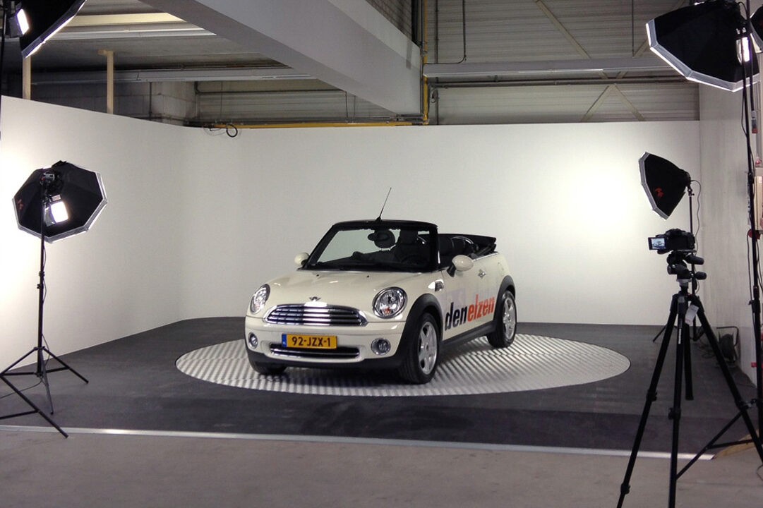 We recommend our Ø 5 metres turntable for photographing vehicles. It is advisable to keep a space of at least 7 x 7 metres free as a photo location, so that you can easily drive onto and off the turntable.