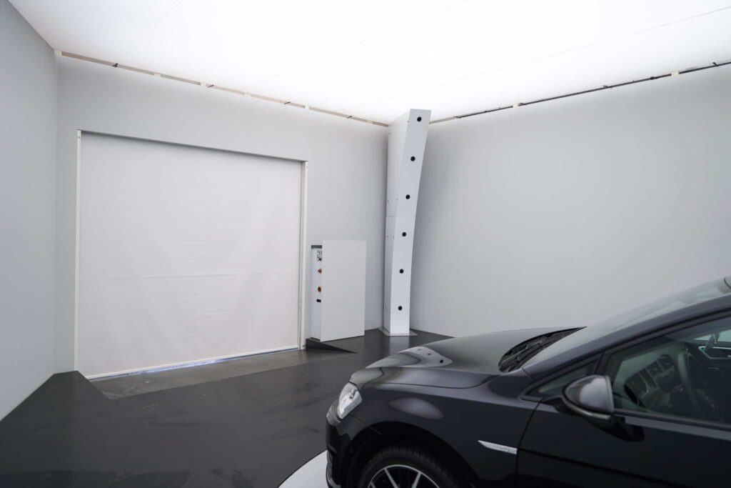 To prevent distracting reflections on the car from outside the studio, Autobedrijf Ficus has chosen for a photo studio with a rolling door. This way, the studio is completely closed and the car is photographed at its best. The rolling door is fully integrated into the software, so it opens and closes when needed. The rolling door is also very safe. Thanks to sensors in the door, it will never close when a car enters or leaves the studio and thanks to the green and red LED strips in the sides of the studio opening, the operator knows whether the car is allowed to enter or exit the studio.