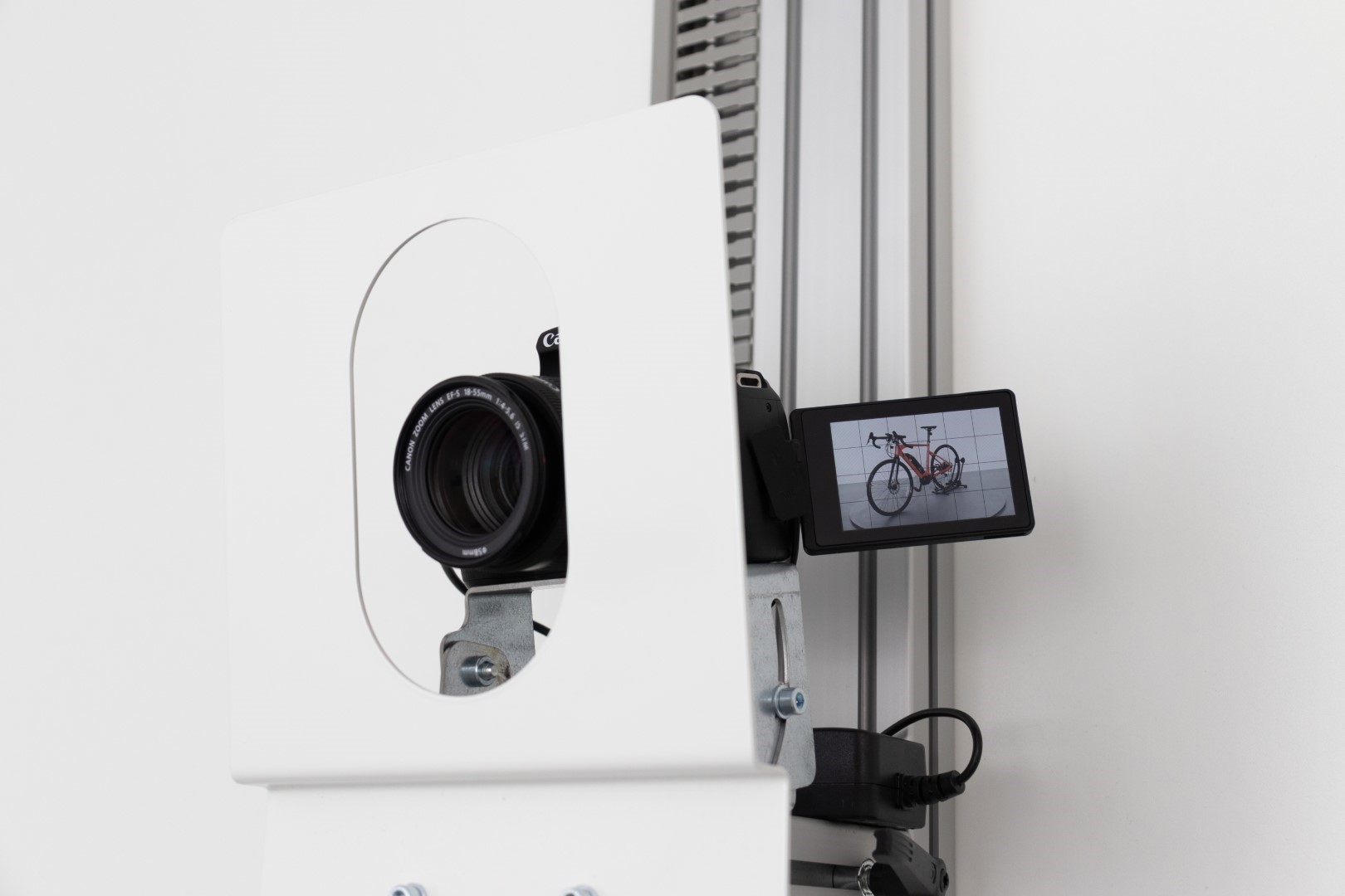 The photo studios are equipped with the Turntable UltraLow with a diameter of 2 metres. This turntable makes it possible to photograph the bikes from any angle, ensuring that all details are clearly visible. The studio has white walls for a professional look and high-quality LED spots for optimal lighting. There are two cameras: a fixed-installed camera and a manual camera used to capture details.